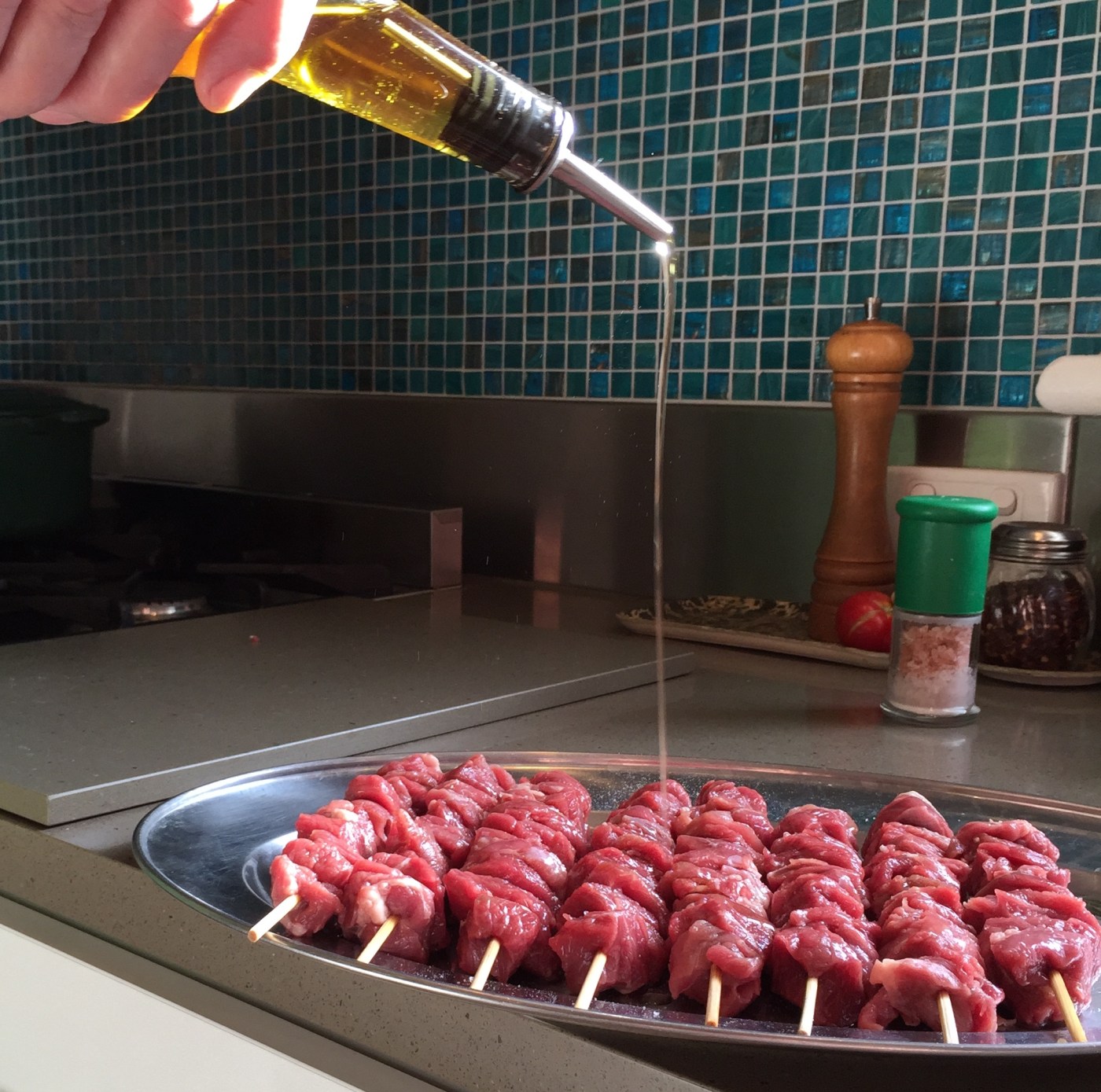 Adelaide’s mediterranean climate provides us with a variety of excellent local olive oils and wines to match with any meal. Once the lamb was skewered and sizzling over the coals, the biggest giveaway that we weren’t in Abruzzo was that we don’t have a proper arrosticini grill. We substituted our little Weber charcoal grill. Our cut of meat was probably slightly leaner that in Abruzzo but Andrew ensured all the cubes of meat were small enough and evenly cut so as to cook evenly without drying out and added a drizzle of oil to each.